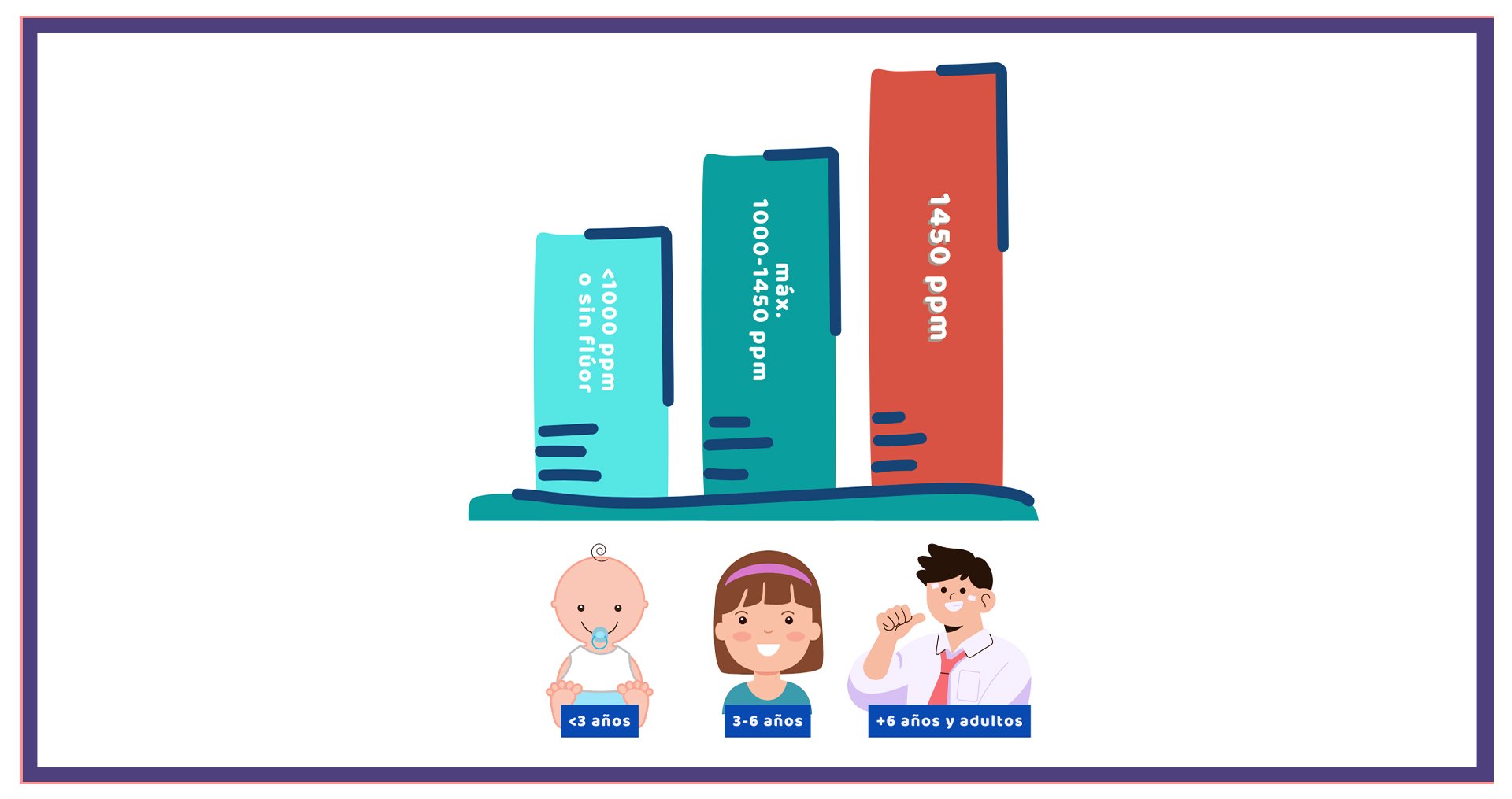 - Pastas dentales con flúor:Existe cierta controversia en cuanto al flúor se refiere. La cantidad de flúor recomendada depende en realidad de la edad de la persona. En niños menores de tres años es recomendable que la cantidad de flúor no supere los 1.000 ppm. En aquellos pequeños de entre tres y seis años, se recomiendan las que contienen como máximo entre 1.000 y 1.450 ppm. Para las personas mayores de seis años, una pasta dental con 1.450 ppm. será adecuada.El flúor es un inhibidor de bacterias, por eso evita la formación de placa y actúa en consecuencia disminuyendo la aparición de caries. Es importante emplear una pasta adecuada ya que ingerir grandes cantidades de flúor de manera continuada puede causar pequeñas manchas marrones en los dientes.